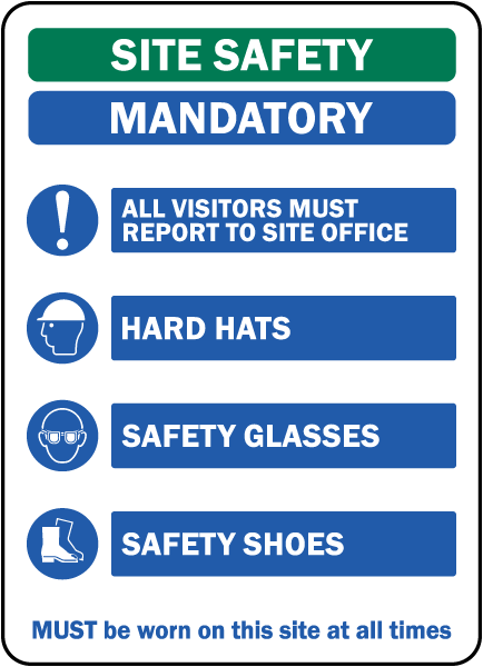 Sign Meaning: The sign emphasizes mandatory safety measures on the site, requiring all visitors to report to the site office and wear specific personal protective equipment (PPE) at all times, including hard hats, safety glasses, and safety shoes. Compliance with these requirements is essential for ensuring the safety of personnel.